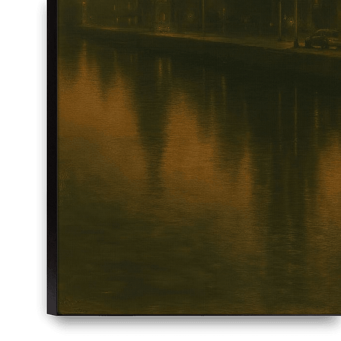 Ein warmer Abend bricht über Gouda herein, getaucht in das sanfte Orange der Straßenlaternen und in einen glühenden Himmel. Zwei stattliche Windmühlen und ein Kirchturm heben sich von der Abenddämmerung ab, während ein Auto an einer Ampel hält und Enten friedlich über das Wasser gleiten. Die Spiegelungen tanzen auf der Wasseroberfläche…