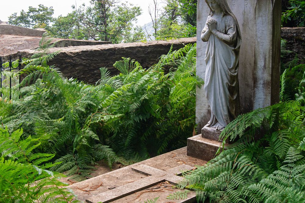 Grab mit Farnen drum herum, das im Sommer auf der Insel Korsika in Frankreich eine Marienstatue trägt.