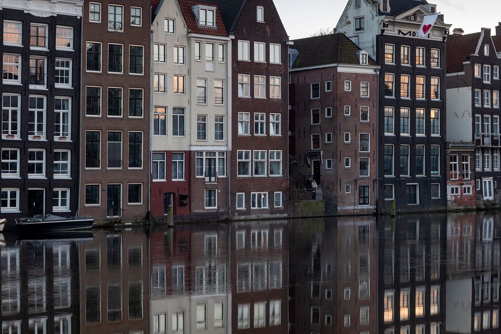 charakteristische Grachtenhäuser am Damrak in Amsterdam und ihre Spiegelung im Wasser