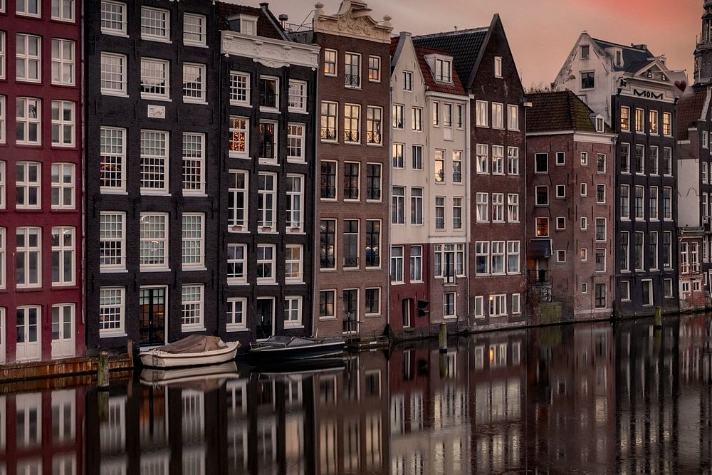 charakteristische Grachtenhäuser am Damrak in Amsterdam und ihre Spiegelung im Wasser