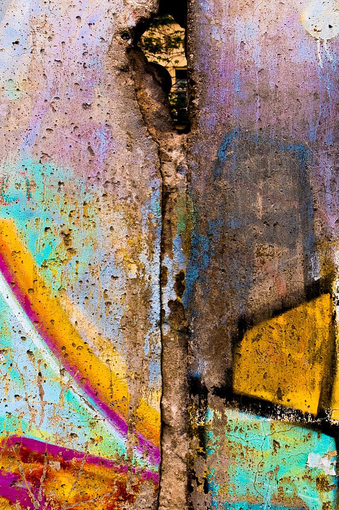 Ein mit Graffiti bemalter Teil der Berliner Mauer und ein Loch in der Wand, durch das man auf die andere Seite schauen kann.