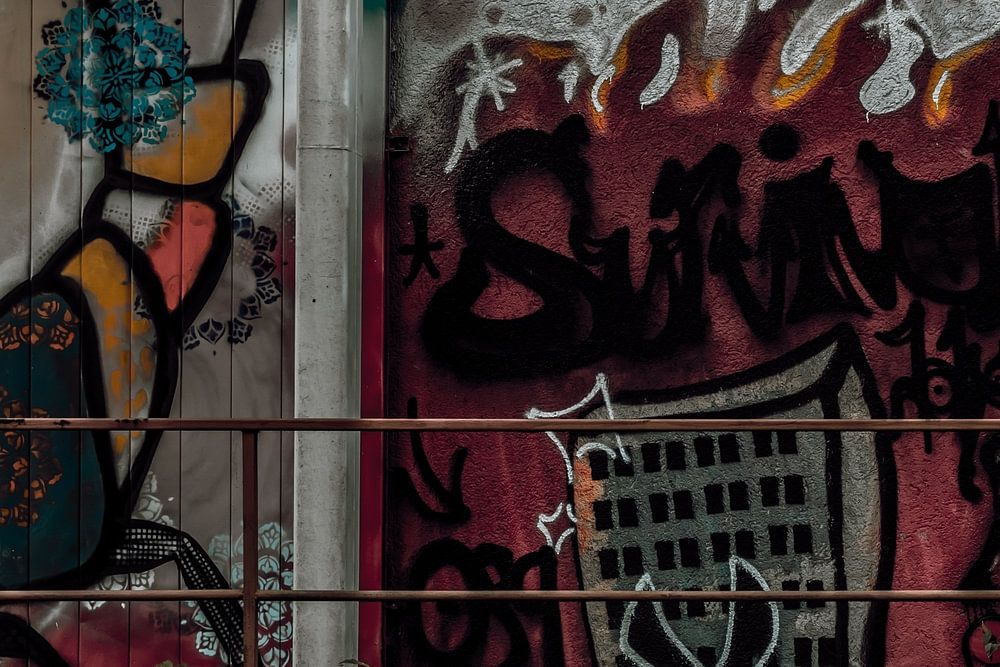 Die gestalterische Formensprache arbeitet mit Brüchen: starre Beton- und Metallflächen treffen auf die ungebändigte Dynamik von gesprühten Linien, Farbflächen und Symbolen. Während die Architektur durch Geradlinigkeit und Raster geprägt ist, erzeugt das Graffiti eine chaotische, organische Gegenbewegung. Die Atmosphäre ist roh, fast düster, zugleich aber voller Energie.