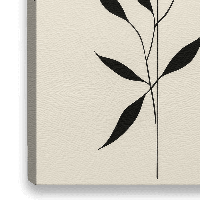 Ein harmonisches Spiel von Form und Farbe, wo ein stilisierter Blütenstängel elegant an einer halbierten, lebendigen Fläche verweilt. Die sanfte Balance zwischen Schwarz und Gold schafft eine ruhige Atmosphäre. Ideal für das Wohnzimmer, verleiht es jedem Raum einen Hauch von modernem Chic und natürlichen Elementen.