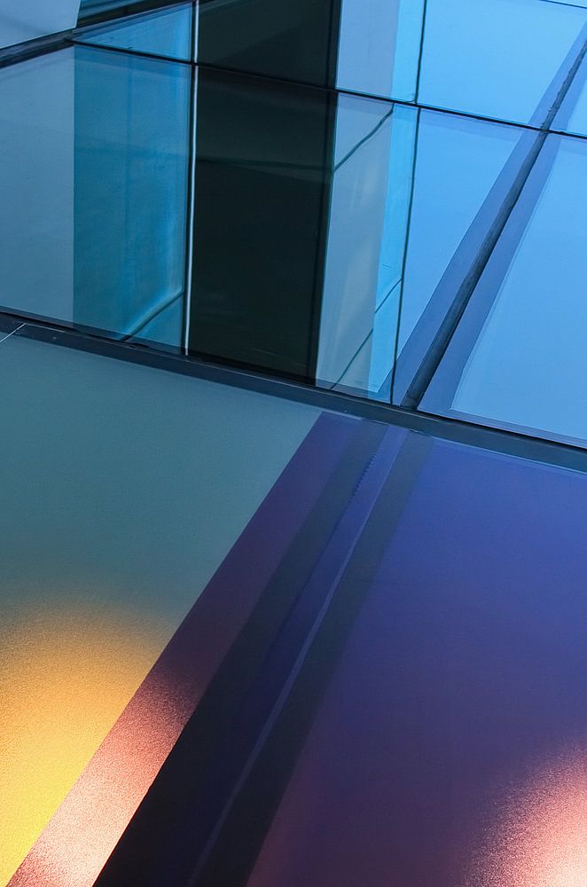Spiel der Linien in bunten moderne Architektur mit einem blauen Himmel spiegelt sich in einer Glasoberfläche
