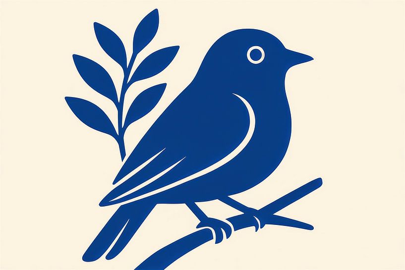 Ein stilisierter Vogel mit runder Silhouette ruht auf einem schlanken Ast mit drei Blättern. Das satte Blau bildet einen klaren Kontrast zum sanften, warmen Hintergrund, während klare Linien und flache Flächen für Ruhe und Ausgewogenheit sorgen. Die kompakten Formen, der Augenring und die subtilen Federlinien verleihen Charakter, ohne…