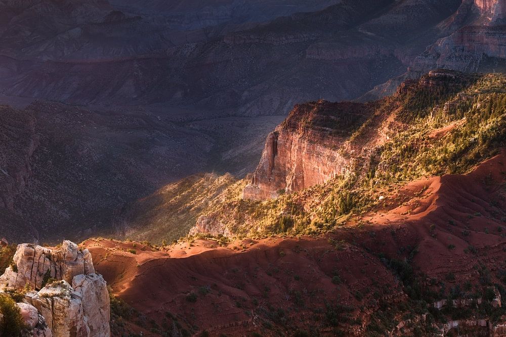 Da das Licht am Morgen besonders tief und intensiv in rot und orange farbenem Licht den Canyon anstrahlt, wirken die Felsen und Schluchten durch das sehr kontrastreiche und warme Licht besonders imposant und mächtig. Landschaftsbild USA 320148ays