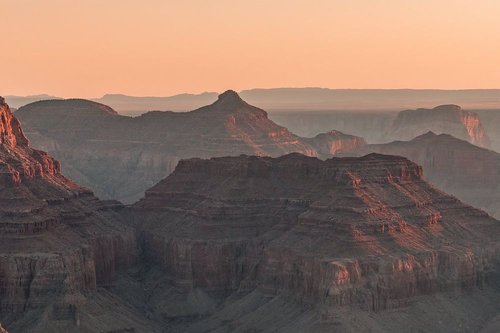 Ein konzentrierter Ausschnitt des Grand Canyon kurz vor Sonnenaufgang. Der morgendliche Dunst liegt noch in der Luft, während das erste Licht des Morgens die Landschaft in ein sanftes Licht taucht. Grand Canyon National Park, Arizona, USA.