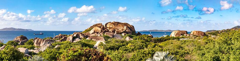 Panorama von den Granitfelsen auf der Insel Virgin Gorda, im Hintergrund Jachten und ein Schiff, ein blauer Himmel mit Wolken, eine Felsen-Insel im Karibischen Meer.