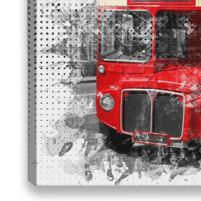 Der Palace of Westminster befindet sich in der City of Westminster direkt an der Themse. Eines der typischen roten Busse fährt über die Westminster Bridge. Eine urbane Szene aus dem Herzen von London. Ein dekoratives Gesamtkunstwerk mit malerischen Nuancen und grafischen Elementen.