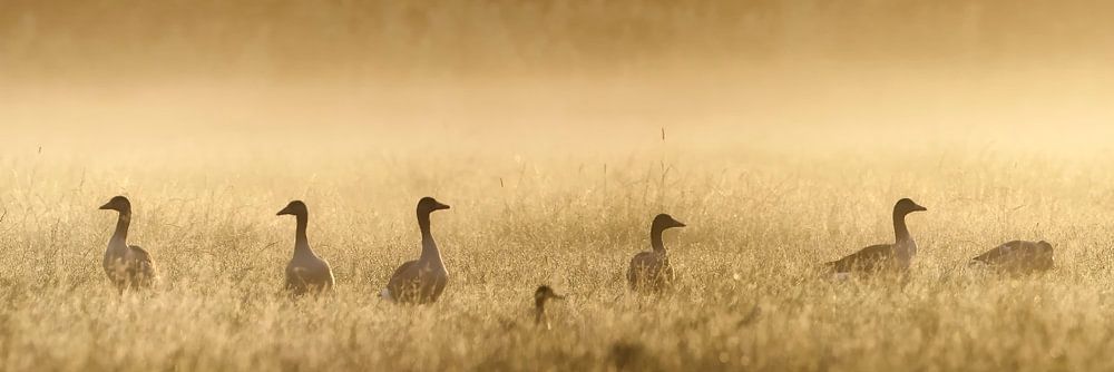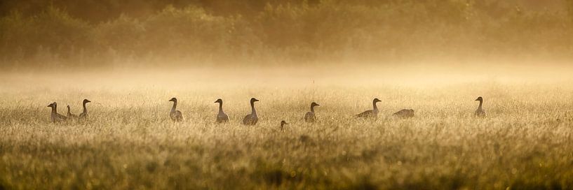 Niederlande, 's-Graveland, Graugänse (Anser anser) im Morgennebel. Panoramafoto 3:1.