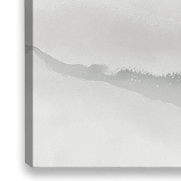 Gelassene Abstraktion aus weichen Farbflächen, die horizontal über die Leinwand fließen. Der vorherrschende Farbton ist ein sanftes Graugrün (Farbe), durchsetzt mit Schichten von Weiß und hellem Beige, wodurch das Ganze an ein ruhiges Meer oder eine neblige Dünenlandschaft erinnert. Die fließenden Linien suggerieren Bewegung, aber…