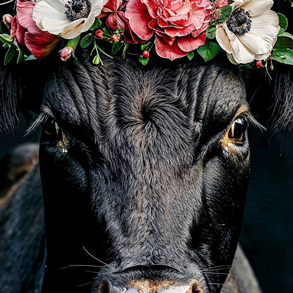 Die Komposition spielt mit Licht und Schatten, wobei die zarten Blüten wie Lichtflecken erscheinen, die die Dunkelheit durchbrechen. Jedes Blütenblatt scheint mit größter Sorgfalt ausgewählt zu sein, um diese lebende Skulptur zu krönen. Die Symmetrie der Hörner und der sanfte Blick des Rindes laden den Betrachter ein, sich in diesem Anblick zu verlieren und die ruhige Kraft, die davon ausgeht, zu spüren.