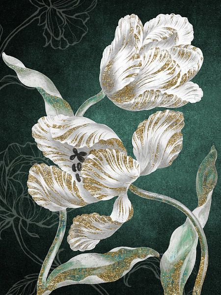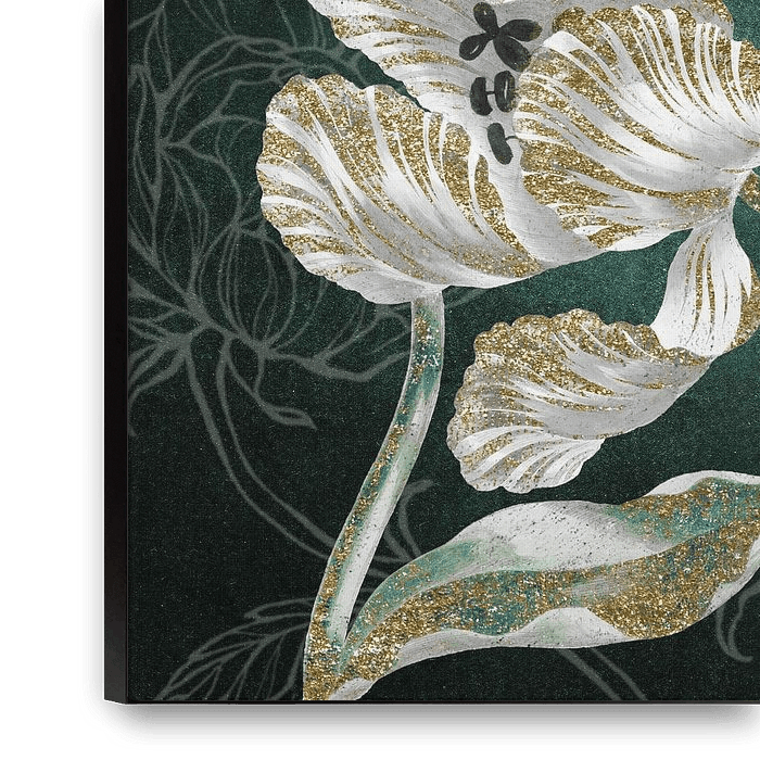 Die organischen Formen der Blumen, bereichert durch schimmernde goldene Akzente, heben sich eindrucksvoll von einem tiefen, dunkelgrünen Hintergrund ab.
