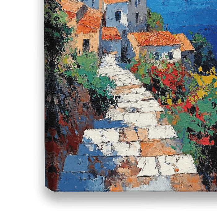 Griechenland Kunst | Azure Serenity - Dieses Landschaftsgemälde zeigt ein bezauberndes Dorf in Griechenland, eingebettet an der Küste mit traditionellen weiß getünchten Häusern und einer Wendeltreppe, die zum azurblauen Meer führt.