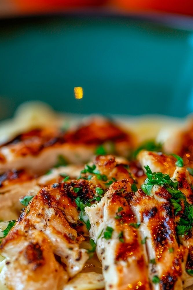 Ein köstliches Menü aus perfekt gegrilltem Hähnchen auf samtigen Linguine, geschmückt mit frischen Kräutern und einer verlockenden Sahnesauce, versetzt in unmittelbare Vorfreude auf den nächsten Biss. Dieses appetitliche Meisterwerk mit seinen warmen Farben und der einladenden Präsentation findet seinen idealen Platz in der Küche oder dem Esszimmer und animiert zu geselligen Kochabenden.