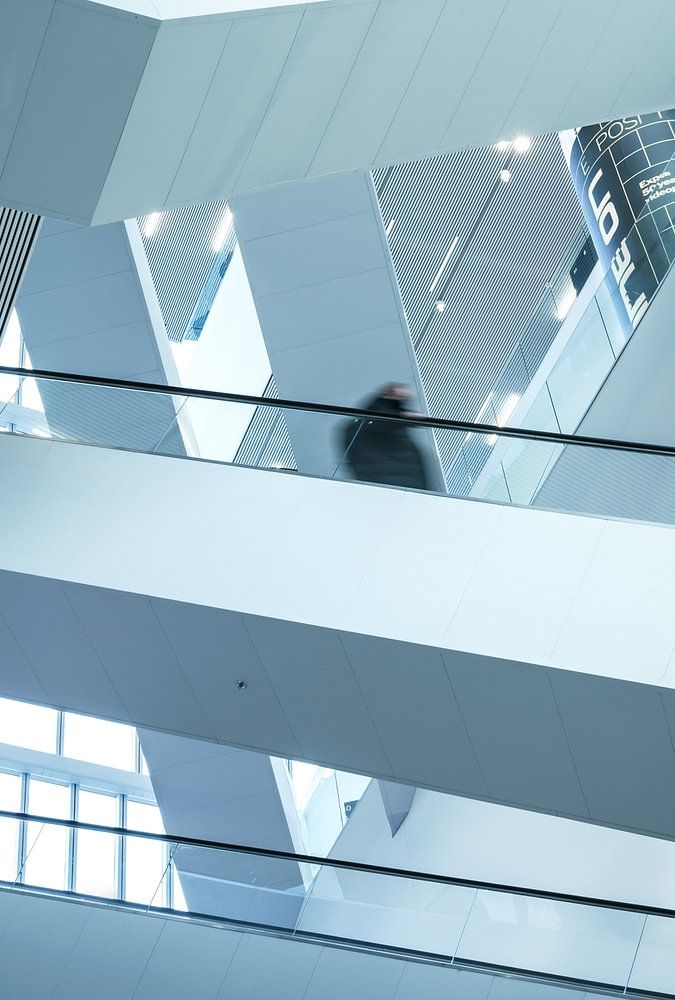Schönes Linienspiel der vielen Rolltreppen und Etagen im Groninger Forum. Die Geräumigkeit und Schichtung des Innenraums wird auch durch die beiden Personen auf der Treppe unterstrichen. Die kühlen Schattentöne, die weißen Lichter und die starken Kontraste verleihen dem Bild einen monochromen, fast abstrakten Charakter.