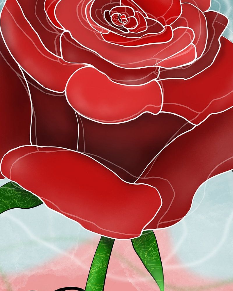 Eine digitale Illustration einer roten Rose. Die Rose sieht aus wie eine eingefärbte Strichzeichnung, bei der die Linien der Blüte weiß sind. Diese Linien werden in einer transparenten Version oberhalb und unterhalb der Rose noch einmal wiederholt. Unterhalb der Blume sind die Linien verschwommen. Die Rose ist in verschiedenen Rottönen gefärbt und hat auch einige Schatten und Lichter. Der Stängel ist grün, wobei die Linienzeichnung der Rose als Textur dient, und hat einige Blätter. Auch unter der Blume befinden sich einige grüne Blätter.