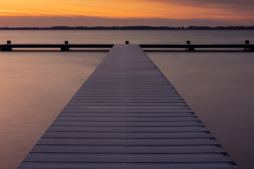 Foto eines langen T-förmigen Stegs im See bei Sonnenaufgang am Morgen. Es war kalt, auf dem Steg lag Eis. Die Sonne kommt ein wenig durch einen Wolkenrand. Durch die Verwendung von Filtern konnte ich die Verschlusszeit verlangsamen, um das Wasser ruhiger zu machen. Es lief ziemlich gut. Leider ist mir später einer der Filter durch die Kälte aus den Händen geglitten und liegt jetzt auf dem Grund des Zuidlaardermeers. Zum Glück haben wir das Foto noch...