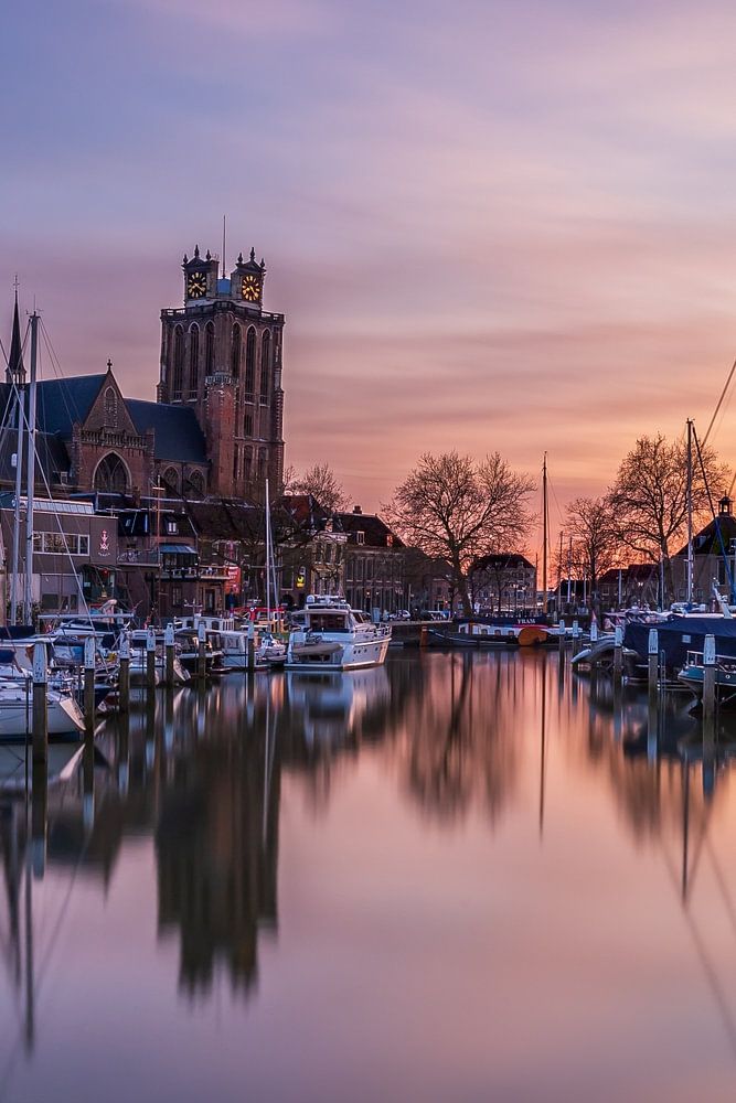 Dieses Foto des historischen Stadtzentrums von Dordrecht mit Blick auf die Grote Kerk wurde an einem Abend im April 2015 von einer kleinen Brücke in der Nähe des Nieuwe Haven aufgenommen.