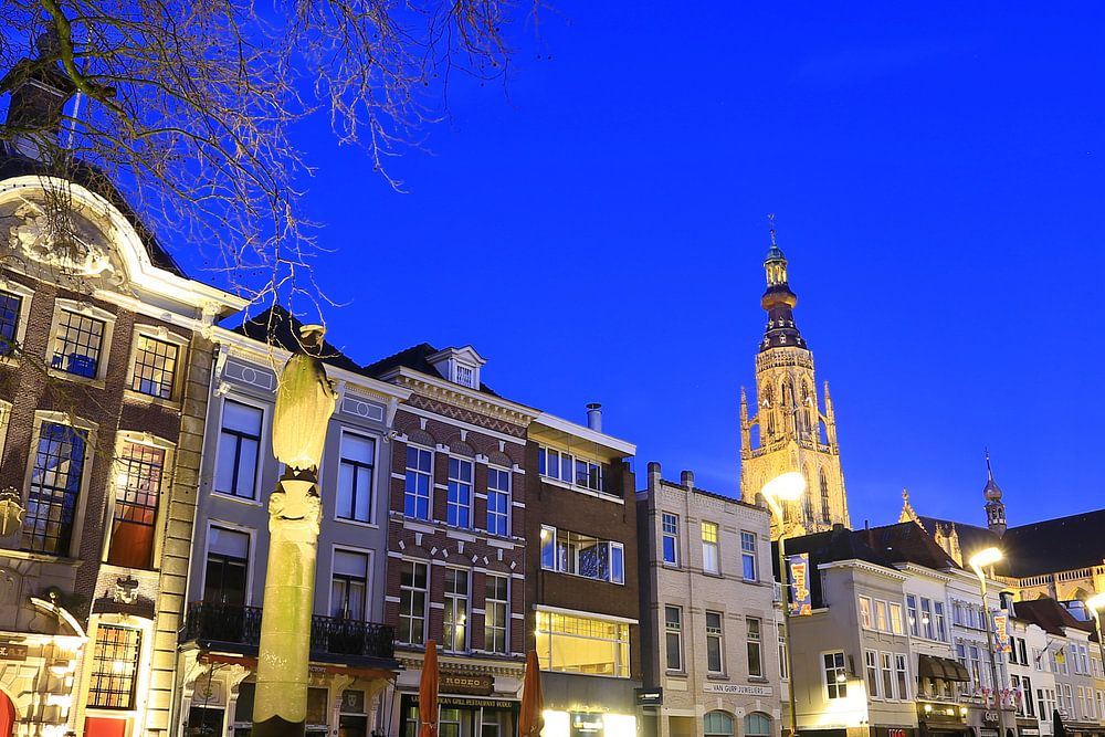 Blauwe uur op Grote Markt Breda met de Onze-Lieve-Vrouwe Kerk.