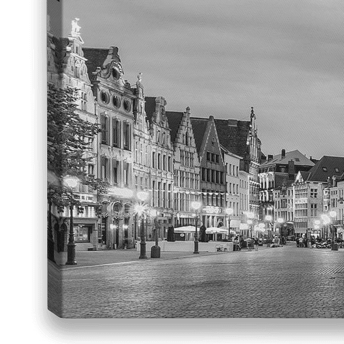 Schwarzweissfotografie UNESCO Weltkulturerbe Zunfthäuser und der Dom ( die Liebfrauenkathedrale ), auf dem Grote Markt in Antwerpen bei Nacht, Flandern, Belgien