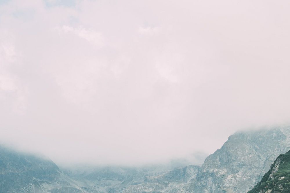 Landschaft mit grünen Bergen hinter Wolken und Nebel