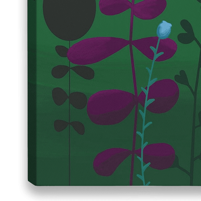 Außergewöhnliche Blumenformen auf einem üppigen grünen Hintergrund. Kräftige Farben kombiniert mit geometrischen Formen. Man kann stundenlang in dieser Fantasiewelt herumwandern.