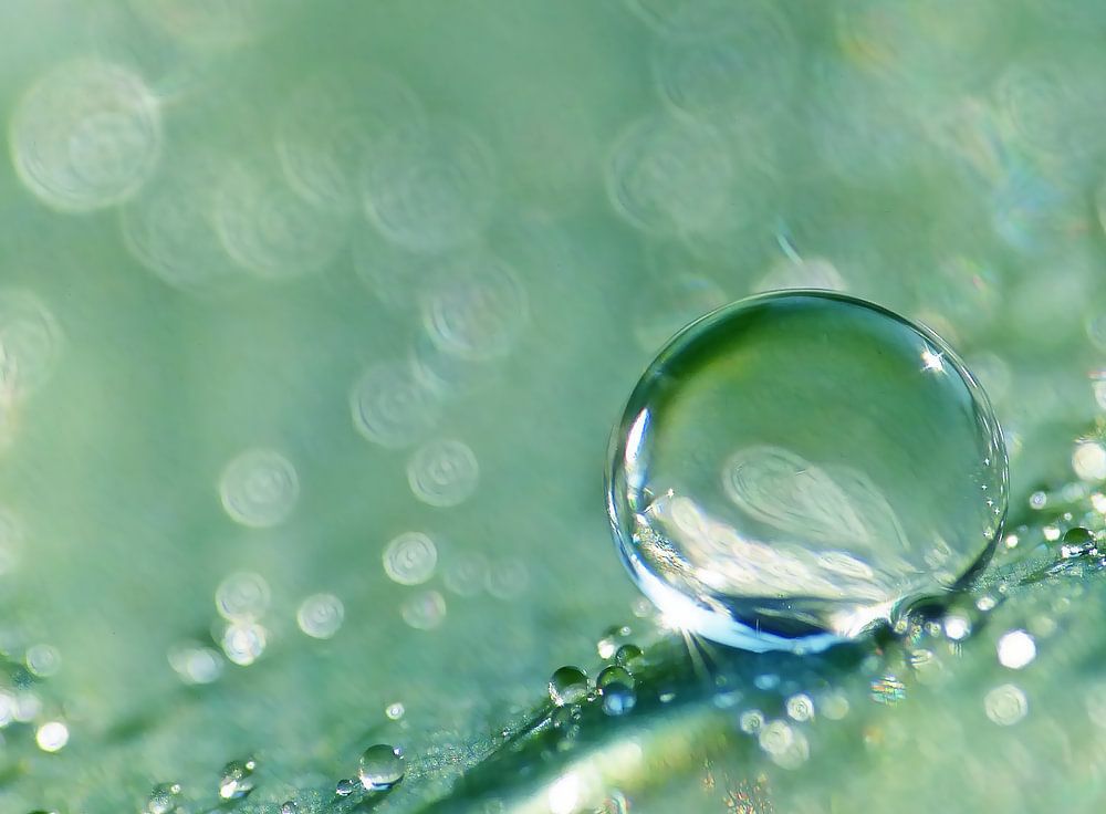 Ein schöner und atemberaubender Tropfen mit Bokeh (Lichter im Hintergrund). Es ist wie eine Perle! Die schönen Pastelltöne haben eine sanfte Ausstrahlung. Eine natürliche und erhabene Makroaufnahme!