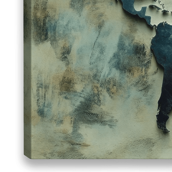 Eine Weltkarte in tiefen Grüntönen und verwitterten Texturen, die sofort eine geheimnisvolle Atmosphäre erzeugt. Dieses Kunstwerk weckt Reiselust, beflügelt die Fantasie und verleiht jedem Raum zusätzliche Energie.
