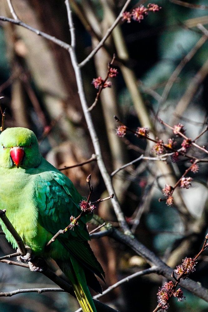 Über "Grünkragensittich in einem blühenden Baum in Amsterdam, Niederlande"