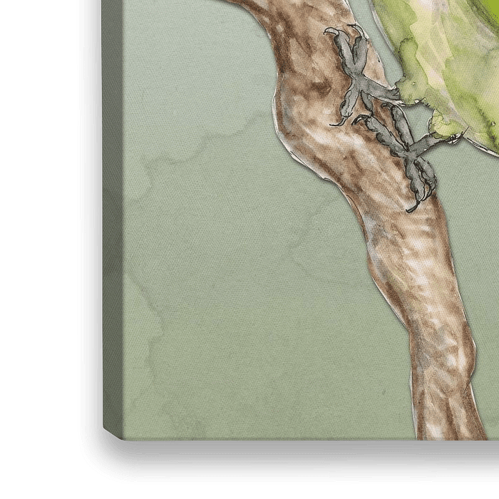 Eine Aquarellzeichnung eines Grünspechtes, der auf einem Baumzweig sitzt. Sie können den Vogel von der Seite sehen. Er schaut Sie mit einem Auge an. Der Hintergrund wurde digital hinzugefügt.