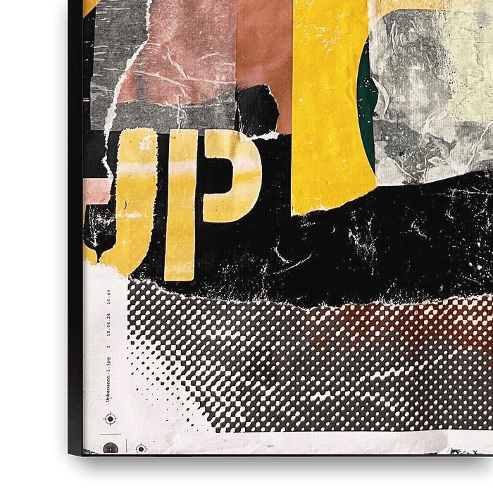 Diese Grunge Collage von Johannes Richter nutzt Gelli Prints und Reklameplakate, um ein einzigartiges Kunstwerk zu schaffen. Perfekt für moderne Wohnräume.