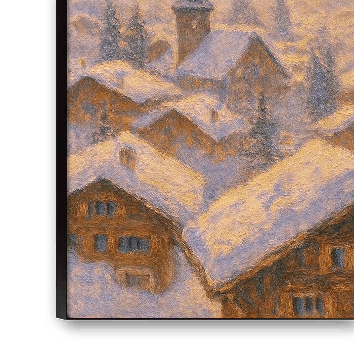 Wenn die Dämmerung über Gstaad hereinbricht, legt sich ein goldener Schleier über die Dächer des Dorfes und verwandelt den Schnee in ein lebendiges Licht. Die Kirchturmspitze erhebt sich sanft zwischen den Chalets, und das letzte Licht des Tages verweilt wie eine Erinnerung. Dieses Kunstwerk verkörpert die Anmut der Winterdämmerung, in der die Grenze zwischen Tag und Nacht zu einem Gespräch der Farben wird.