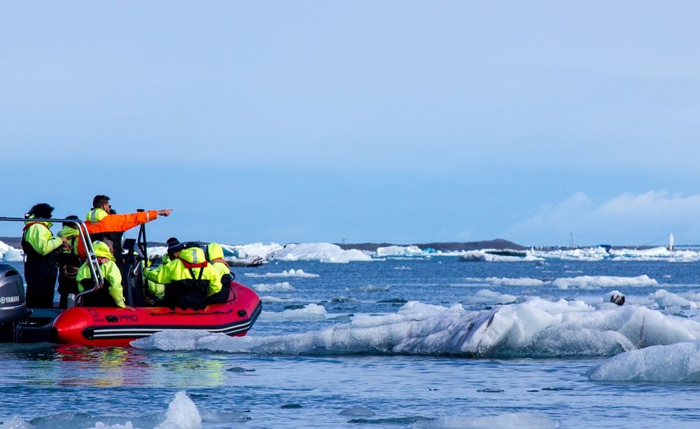 Gummiboot auf dem See Jökulsárlón zwischen den Eisblöcken.