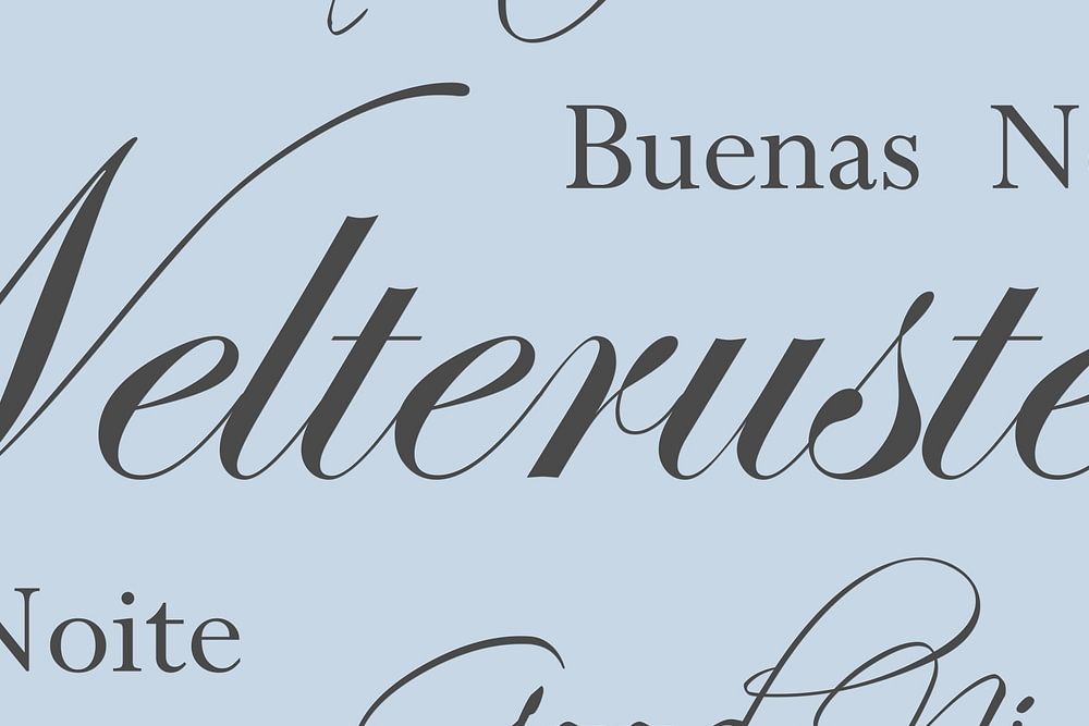 Gute Nacht, Bonne Nuit, gute Nacht. Die Hintergrundfarbe ist blau, die Buchstaben sind weiß. Text auf Leinwand oder anderem Material.