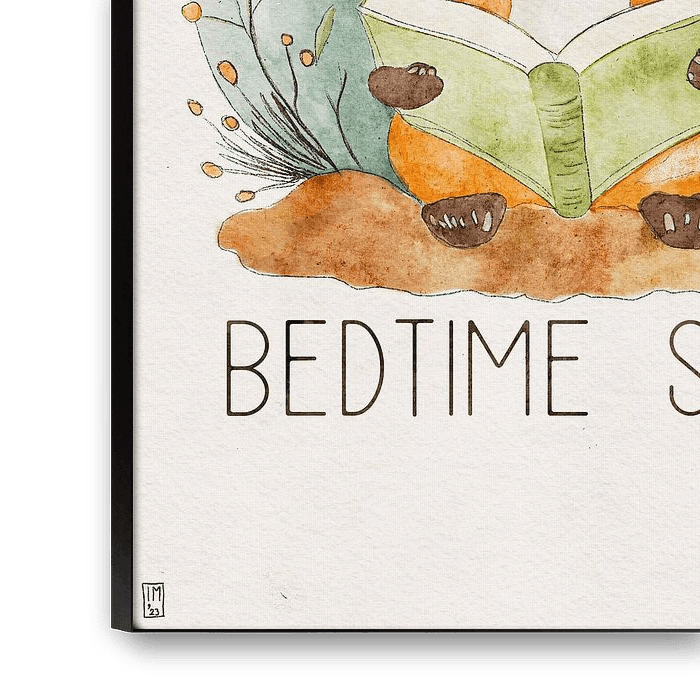 Illustration für das Kinderzimmer. Der kleine Fuchs liest eine Gute-Nacht-Geschichte. Aquarelltechnik.