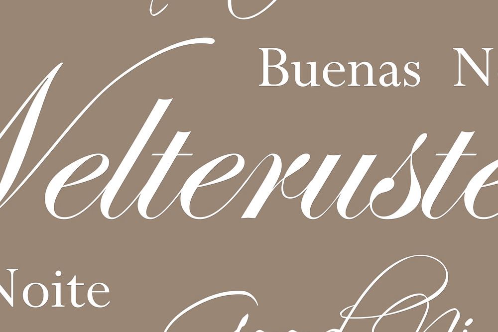 Gute Nacht, Bonne Nuit, gute Nacht. Die Hintergrundfarbe ist hellbraun, die Buchstaben sind weiß. Text auf Leinwand oder anderem Material