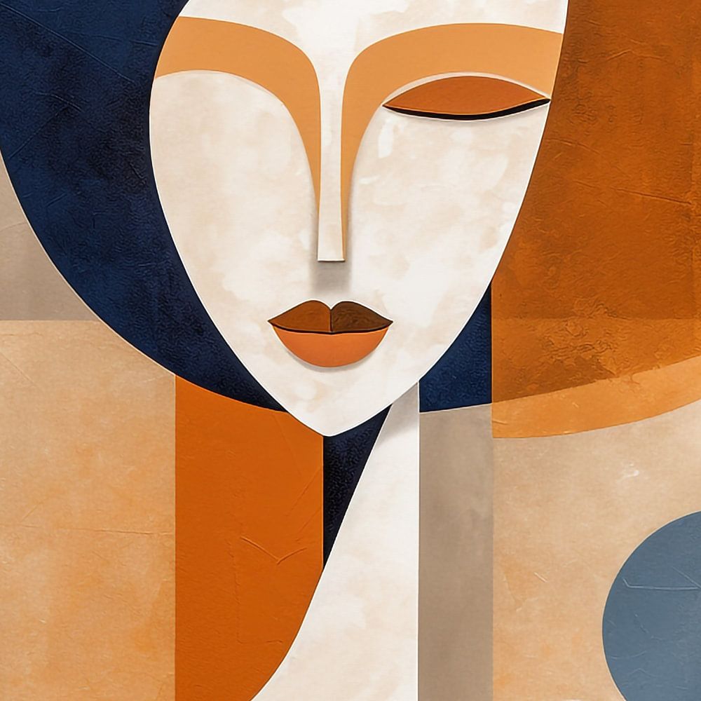 Eine faszinierende und farbenfrohe Komposition einer weiblichen Figur in einem harmonischen, kubistischen Oberflächenmuster. Die Komplementärfarben Ocker, Beige und Blau verleihen dem Werk ein heiteres Aussehen, das durch die Einflüsse der romanischen Kunst noch verstärkt wird. Eine faszinierende Verschmelzung verschiedener Stile und Elemente, die eine schöne, heitere und visuelle Aussage bilden.