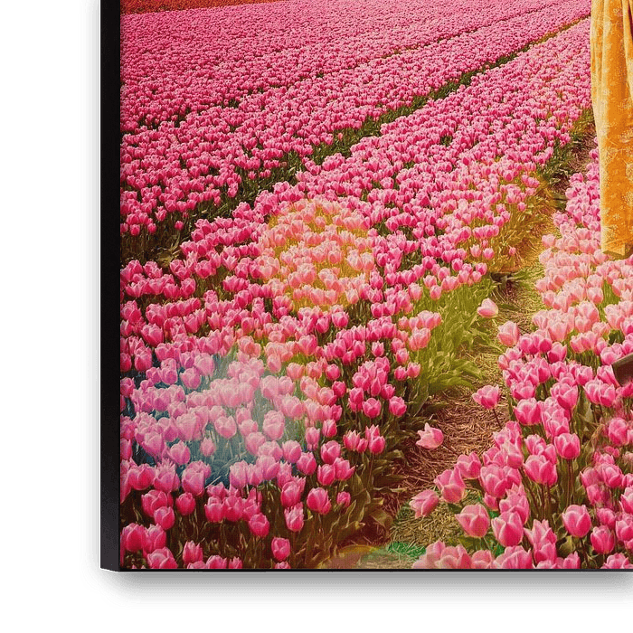 Ein Vintage-Werk mit farbenfrohem Bokeh. Surrealistische Collage, die eine Frau zwischen den Blumenzwiebelfeldern darstellt. Angesichts der Kamera muss man sagen, dass es sich um einen Touristen handelt. Kunst mit einem Augenzwinkern ;-)