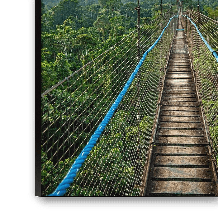 Eine atemberaubende Vertikalaufnahme einer 36 Meter hohen Hängebrücke, die hoch über dem dichten Blätterdach des Amazonas-Regenwaldes in Ecuador schwebt. Bedrohliche graue Wolken füllen den Himmel und verstärken das Gefühl von Geheimnis und Abenteuer. Von diesem einzigartigen Aussichtspunkt aus können Sie exotische Vögel und Wildtiere beobachten, während sich das üppige Grün unter Ihnen bis zum Horizont erstreckt.