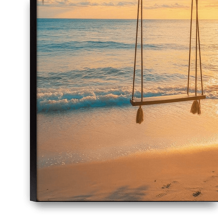 Einmalige Ruhe umhüllt die Szenerie, während goldene Sonnenstrahlen sanft über die Wellen tanzen. Ein einsamer Schwingstuhl, hängend von einer palmengesäumten Melodie, lädt zum Träumen ein. Die sanfte Brise bringt den Duft des Meeres und das Versprechen von Glücksmomenten in dieser tropischen Idylle, wo der Himmel den Ozean küsst.