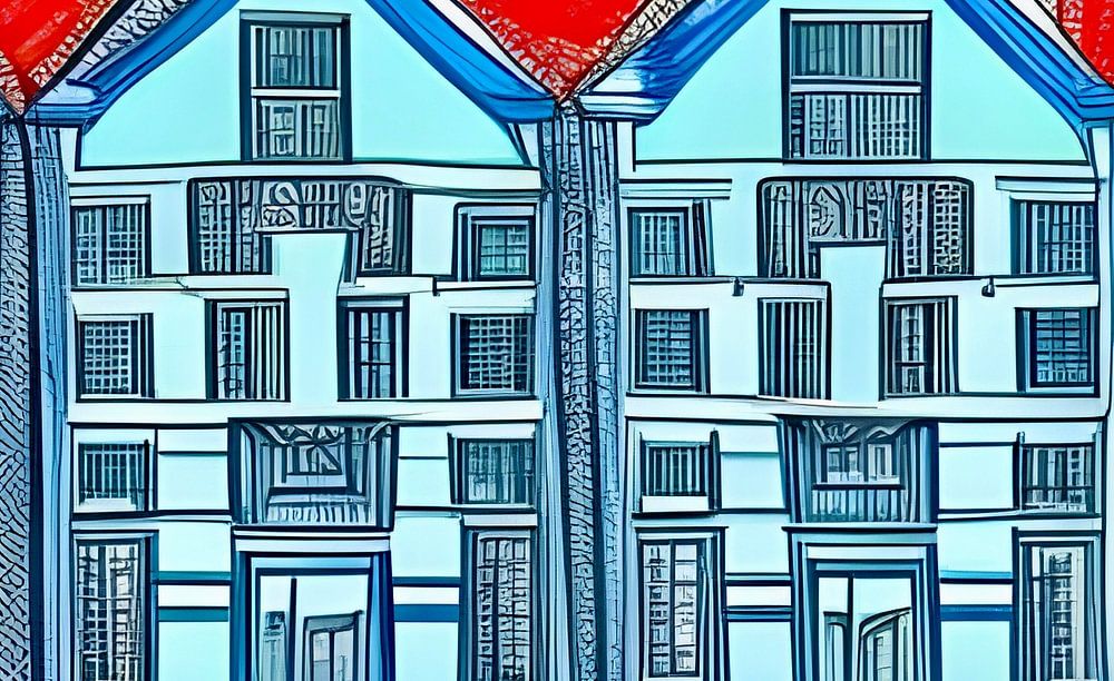 Farbenfrohe Drucke, abstrakte, figurative Illustrationen, die Häuser, Kanalhäuser aus verschiedenen Ländern und Städten darstellen.