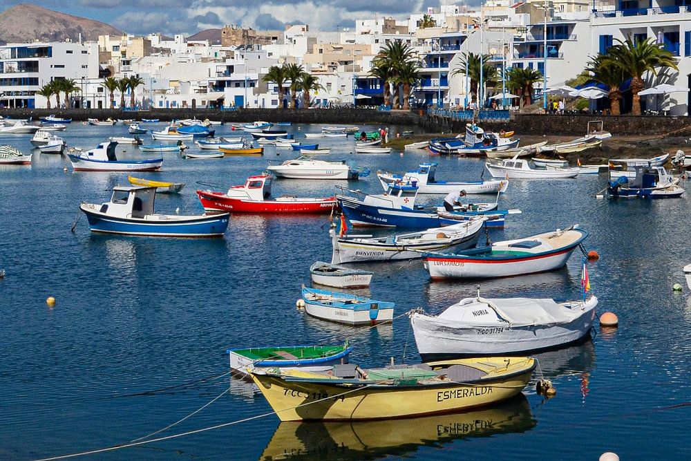Malerischer Hafen in Spanien mit einheimischen Booten und weißen Gebäuden