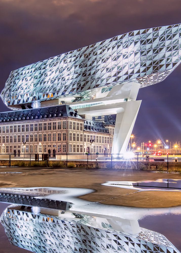 Das ikonische, von Zaha Hadid entworfene Antwerpener Hafenhaus bei Nacht spiegelt sich in einem Teich