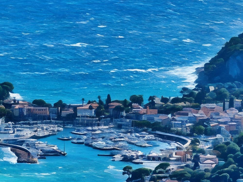 Eine atemberaubende Küstenansicht eines sonnenbeschienenen Hafens an der Côte d'Azur. Türkisfarbene Wellen tanzen gegen die felsige Küste, während Segelboote und Yachten friedlich im Jachthafen liegen. Ein Kreuzfahrtschiff gleitet durch den tiefblauen Horizont und verleiht dieser mediterranen Idylle einen Hauch von Größe und Gelassenheit.