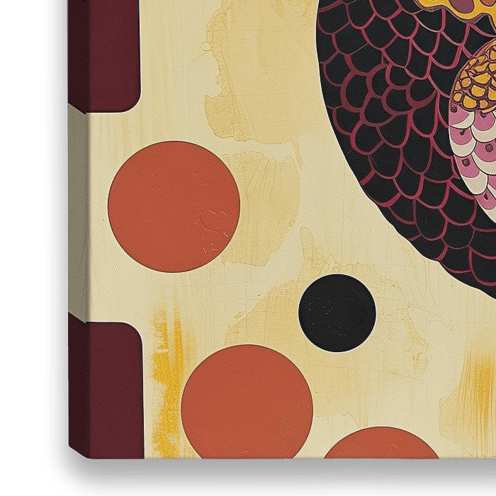 Rooster Painting | Royal Strut - Dieses Hahn-Gemälde zeigt einen auffälligen und farbenfrohen Hahn, der steht und seinen üppigen Schwanz zur Schau stellt. Der Hintergrund des Kunstwerks ist eine abstrakte Mischung aus organischen und geometrischen Formen. Die Texturen und Farben sind besonders auffällig; die Verwendung von Gold und…