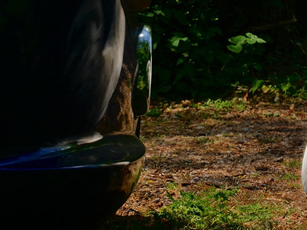 Was das Ganze zu einem Spektakel macht, sind die Kontraste und die Komposition. Schwarzes Auto gegen weißen Hahn, lebloser Stahl gegen wanderndes Tier. Das Schwarz des Autos, die Schatten und die grünen Blätter bilden einen Rahmen um den Hahn.