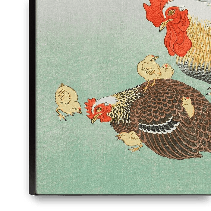 Bestelle Hahn und Hühner mit Küken, Ohara Koson als Reproduktion auf Leinwand, Alu-Dibond, als Poster, Fototapete oder Acrylglasbild.