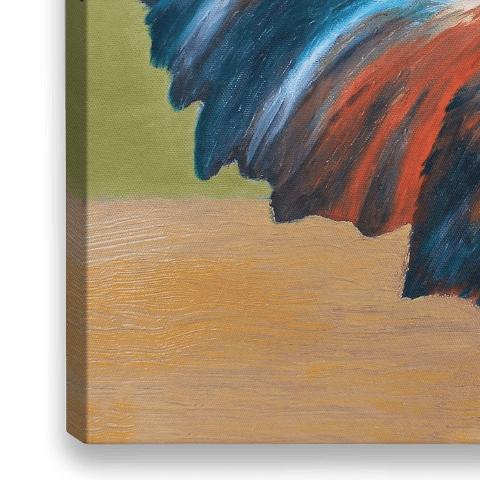 Dieses ausdrucksstarke Ölgemälde zeigt einen majestätischen Hahn in leuchtenden Farben. Mit dynamischen Pinselstrichen und kräftigen Kontrasten wird das stolze Wesen des Tieres eindrucksvoll hervorgehoben. Die lebendigen Rot-, Blau- und Goldtöne verleihen dem Kunstwerk eine kraftvolle Präsenz, während die strukturierte Leinwandmalerei…