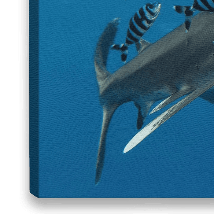 Weißspitzen Hochseehai, (Carcharhinus longimanus) mit Pilotfischen (Naucrates ductor) schwimmt im Roten Meer vor Ägypten.